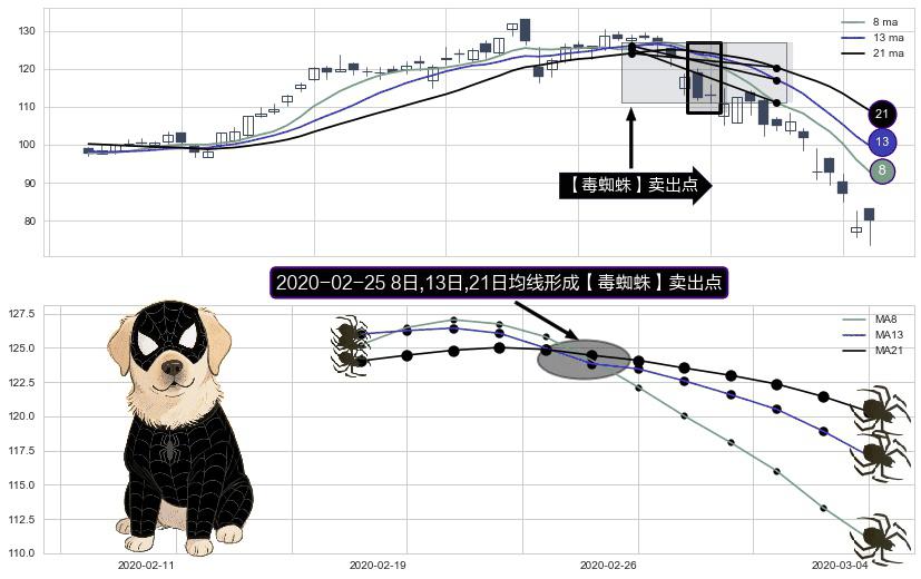 ⚀ 2020-02-25日显现 8日-13日-21日均线 【毒蜘蛛】卖出点 看空信号,后市看跌,卖出