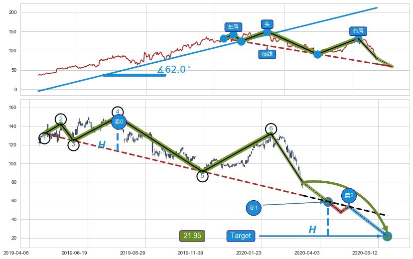 ➣ 最小反转跌幅→𝐇: 36.77 (头部与颈线垂直距离)