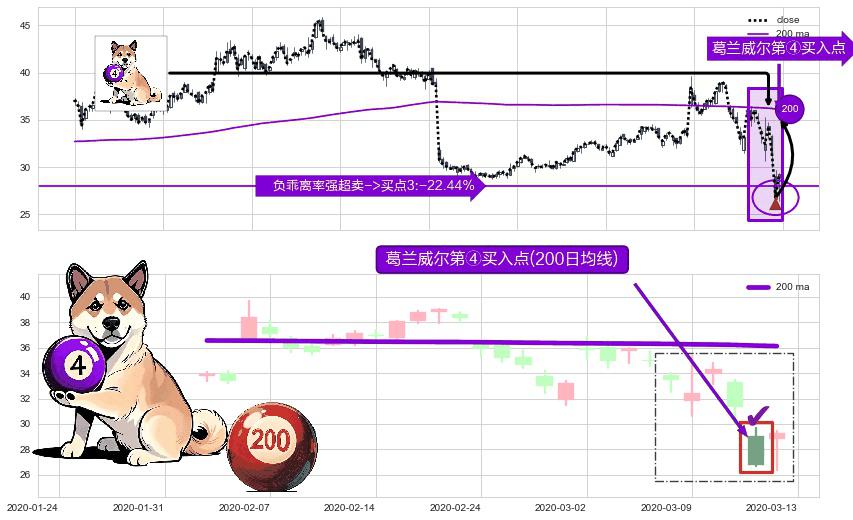 形态多维评估: ⚀ 2020-03-12-日显现 葛兰威尔均线 200日均线 第④买入点 下降趋势均值回复的短线反弹信号,后市看涨,买进信号