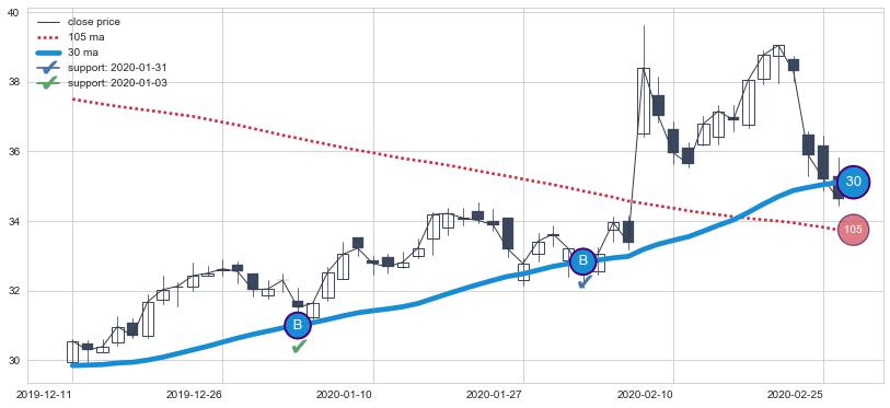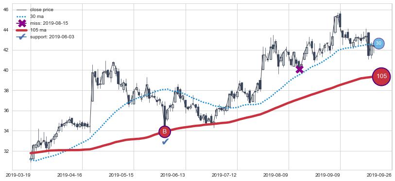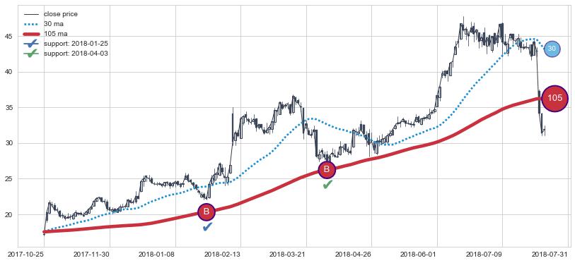 上涨趋势2017-10-25-2018-07-31,均线105确认关键支撑2处