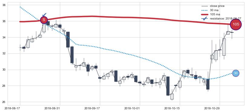 下跌趋势2018-08-17-2018-11-01,均线105确认关键阻力1处