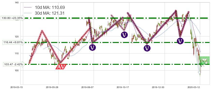 ♘ 阻力价格位103.47,可信任强度71.95%,距离最后交易2020-03-13形成的收盘价格106.04相差 -2.42%