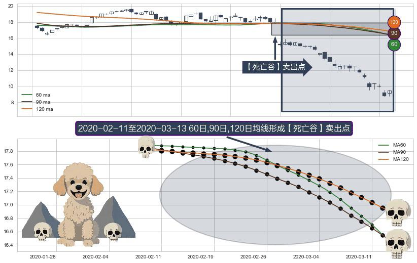 ⚂ 【死亡谷】卖出点 由MA60均线下穿MA90均线和MA120均线,MA90均线下穿MA120均线形成