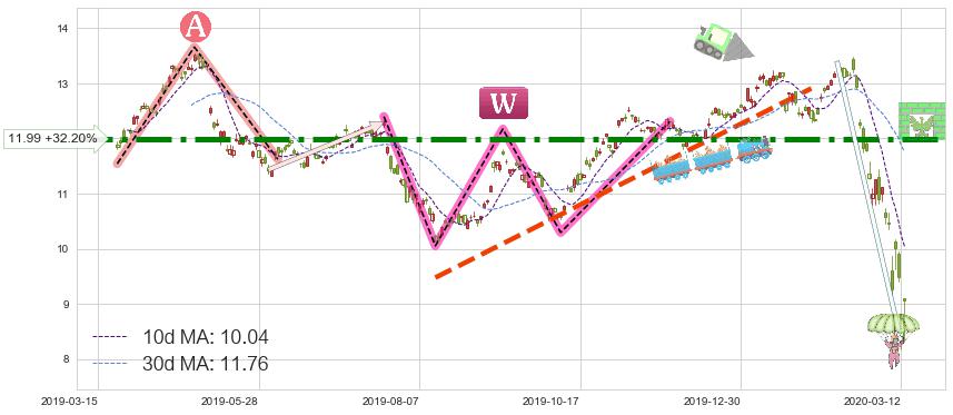 2020-02-03: 时域附近第一阻力位11.99持续的对下跌趋势进行阻拦,有效地放缓了下跌的速度。