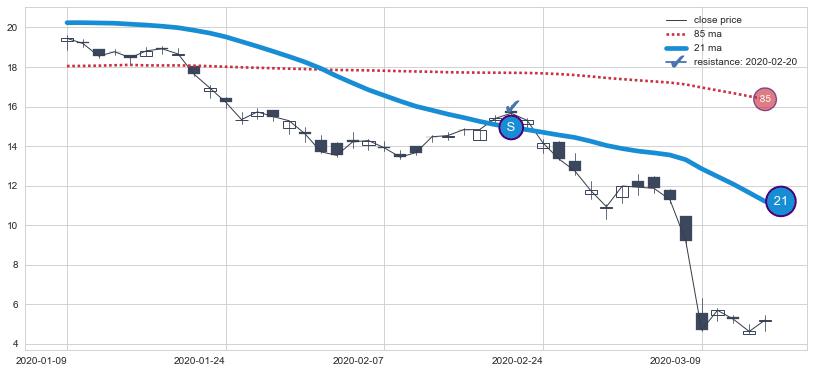⚀ 中期均线MA10下穿长期均线MA20形成的交叉是标准 死亡交叉