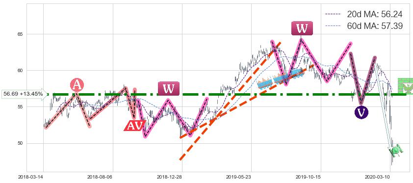 ➢ AI预测: 假定反转如期而至,第❶价格目标位置(2020-05-22, 54.84)