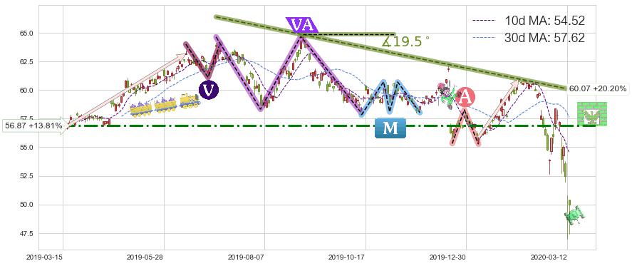 ♞ 10日均线:54.52,30日均线:57.62→ 快线<慢线