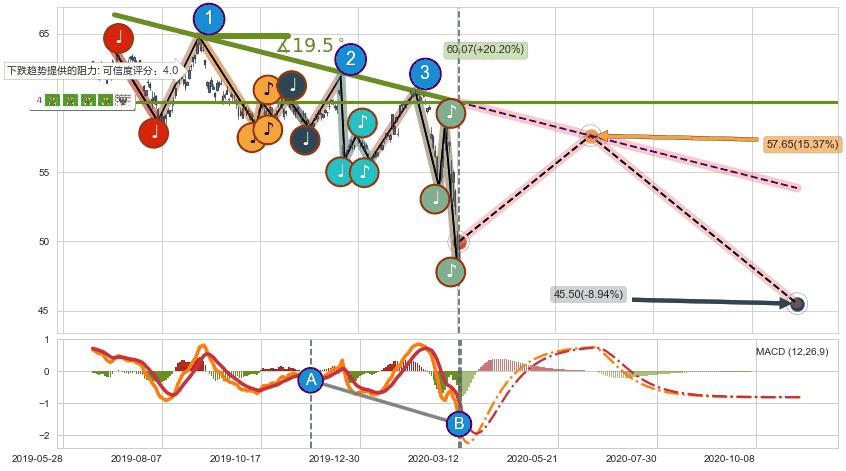 ♘ 在最后的下跌阶段2019-07-03至2020-03-13,存在 持续未破位的阻力位 ,阻力价格60.07,可信任强度83.03%,其距离最后价格49.97相差 +20.20%