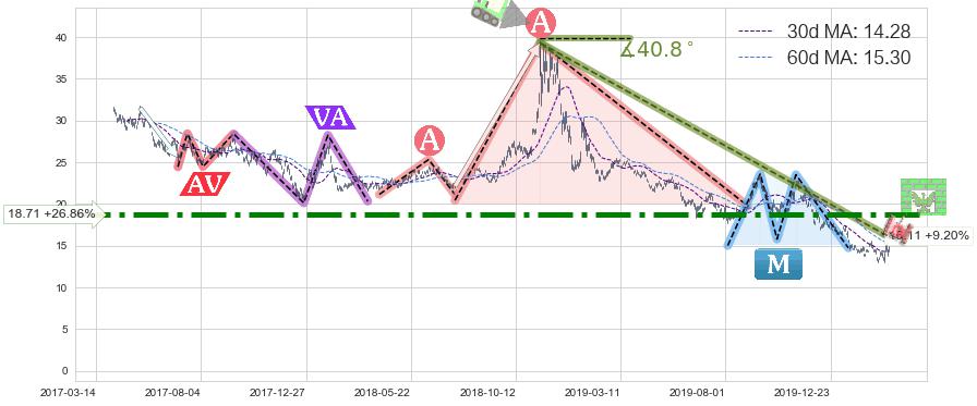 从2018-11-14至2020-03-13,共包含333个交易日,阶段股价下跌-84.47%,阶段股价变动位移路程比: 1 : 7,下跌趋势角度: 40.8
