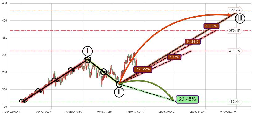 ➣ 循环浪继续向上【平均值】位置(2022-02-28, 370.47),匹配聚类样本比例66.88%, 可能性概率51.86%