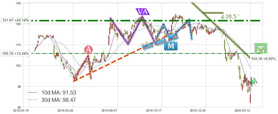 ➢ 【仅预测突破】最后价格:94.23与预测突破价格:97.22→【空间中等】后续最小【整理】第一目标价格→(2020-04-13: 128.60 )