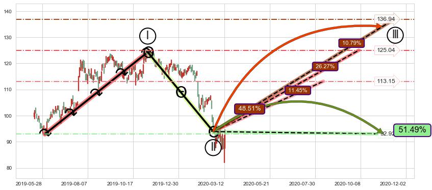 ➣ 循环浪继续向上【平均值】位置(2020-10-06, 125.04),匹配聚类样本比例54.15%, 可能性概率26.27%