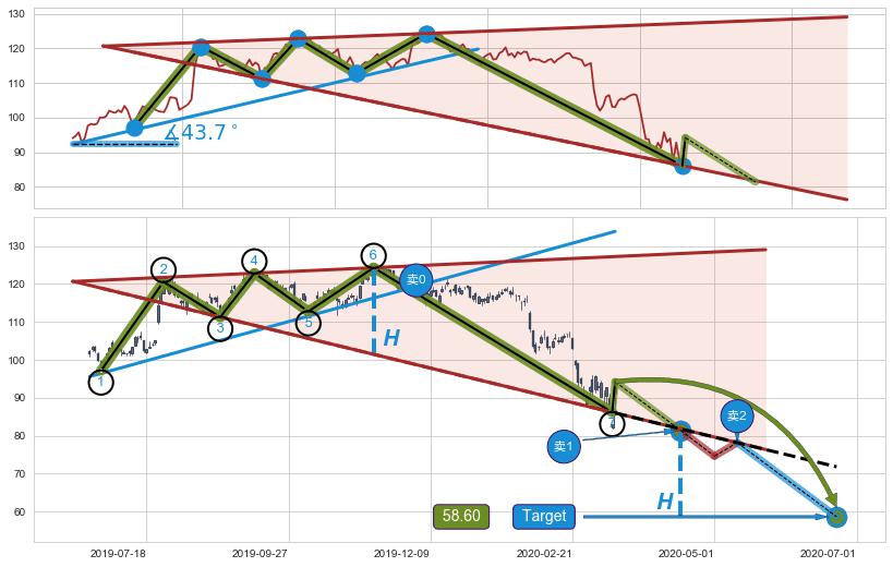➢ 最小反转跌幅→𝐇: 22.85 (逐步抬高阻力斜边最后的阻力点⑥与支撑边垂直距离)