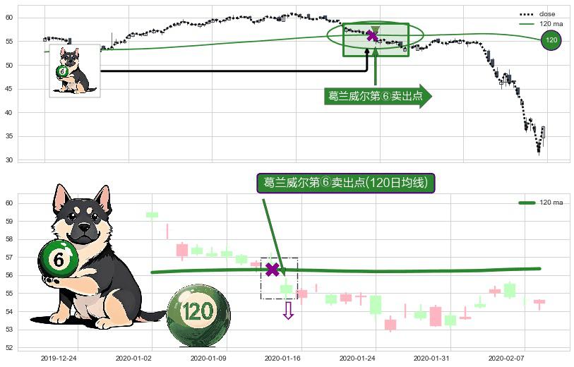 形态多维评估: ⚀ 2020-01-15-日显现 葛兰威尔均线 120日均线 第⑥卖出点 走势反转见顶信号,后市看跌,卖出信号