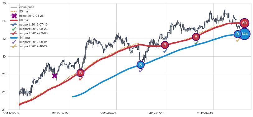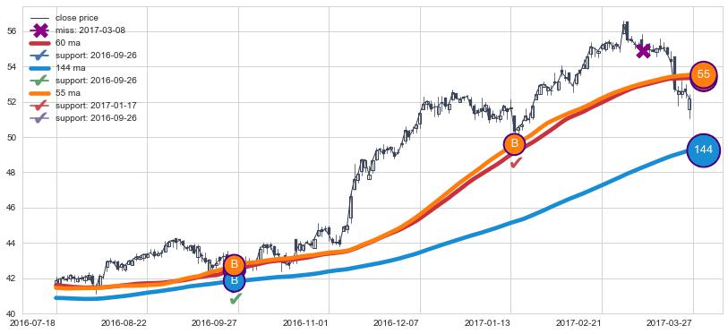 上涨趋势2016-07-18-2017-03-27,均线144, 60, 55确认关键支撑2处