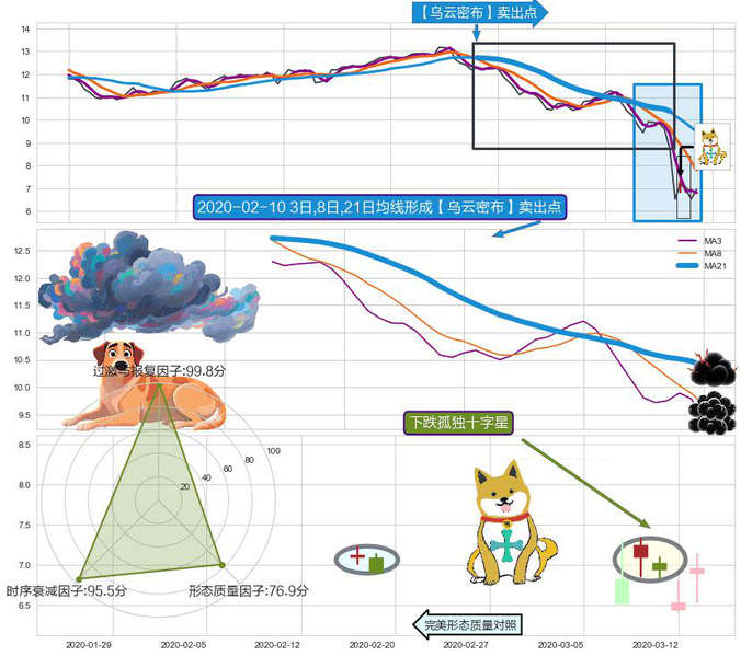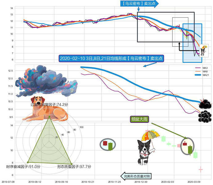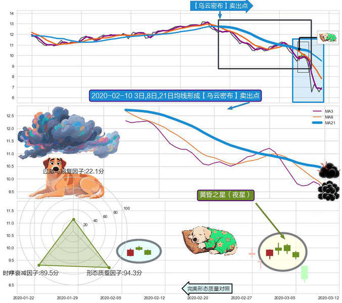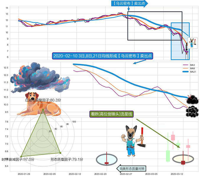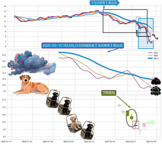 ➣ 2020-01-14日-2020-03-06日显现 3日-8日-21日均线 【乌云密布】卖出点 看空信号,后市看跌,卖出