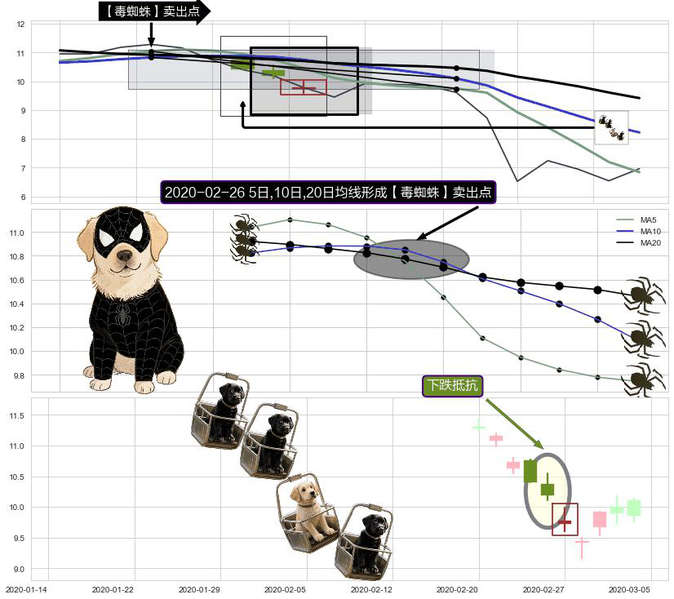 ➣ 【毒蜘蛛】卖出点:均线组合卖出点信号形成后,猜想三条均线周期内的交易者都看空后市,持续下跌