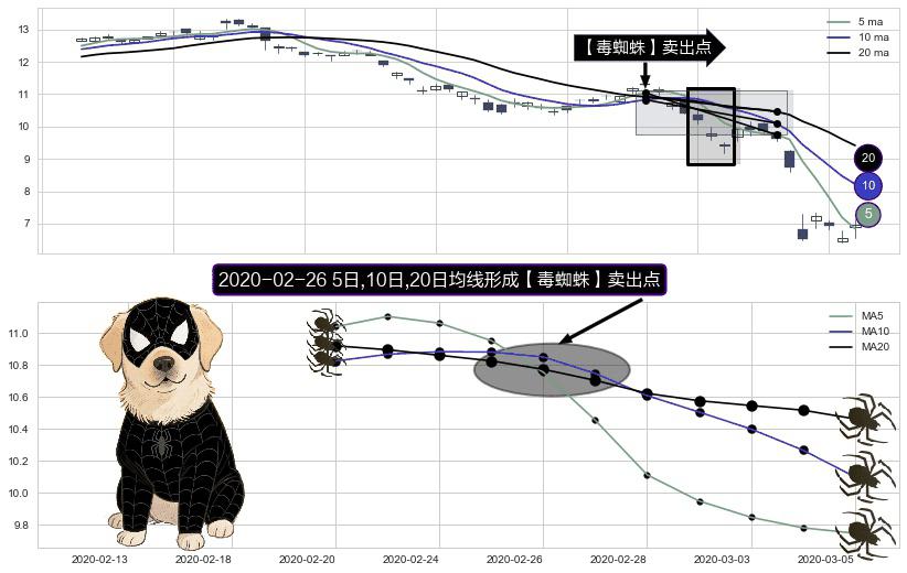 ⚀ 2020-02-26日显现 5日-10日-20日均线 【毒蜘蛛】卖出点 看空信号,后市看跌,卖出
