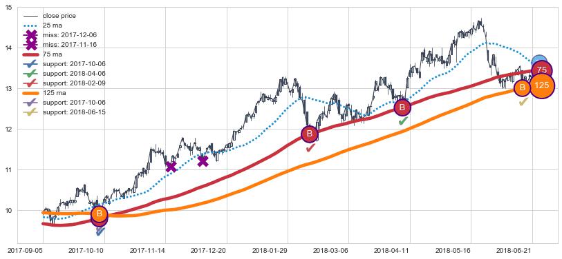 ➢ 最优均线组合共正确确认支撑阻力信号6处,正确确认率 50.00%