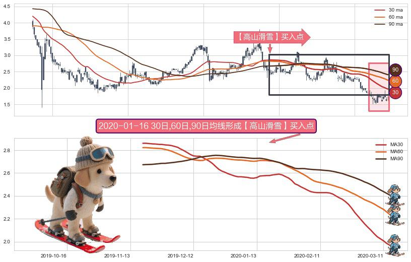⚀ 2019-11-19日-2020-03-13日显现 30日-60日-90日均线 【高山滑雪】买入点 看多信号,后市看涨,买入