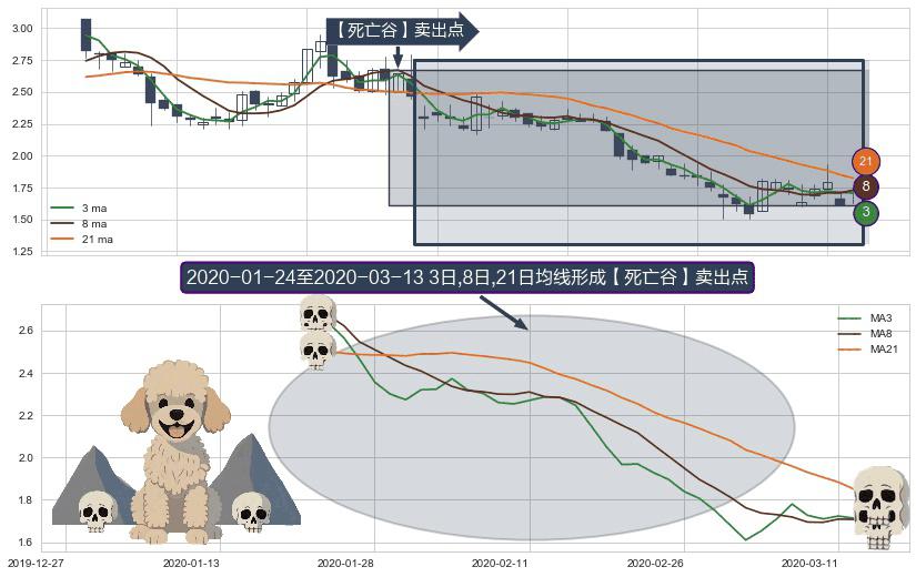⚀ 2020-01-27-日至2020-03-13-日显现 3日-8日-21日均线 【死亡谷】卖出点 看空信号,后市看跌,卖出