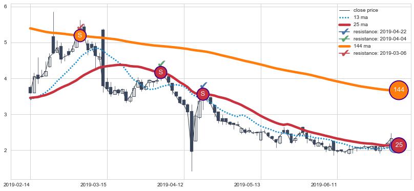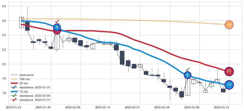 ➢ 最优均线组合共正确确认支撑阻力信号6处,正确确认率 75.00%
