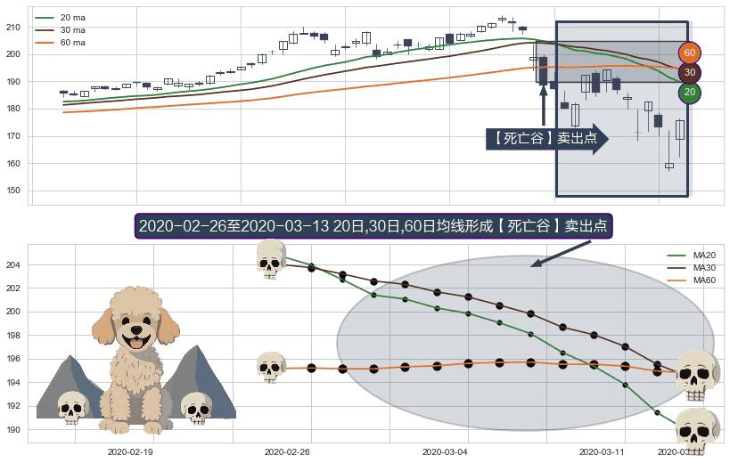 ⚂ 【死亡谷】卖出点 由MA20均线下穿MA30均线和MA60均线,MA30均线下穿MA60均线形成
