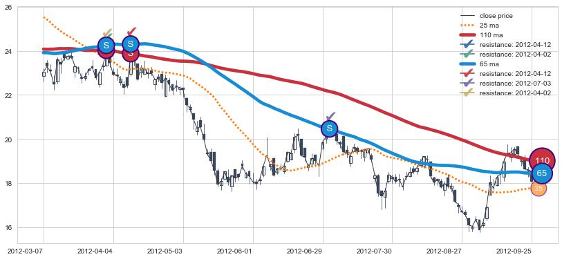 下跌趋势2012-03-07-2012-09-25,均线65, 110确认关键阻力3处