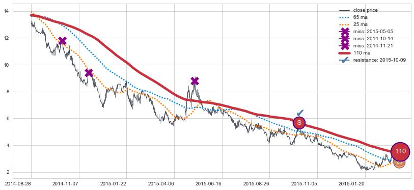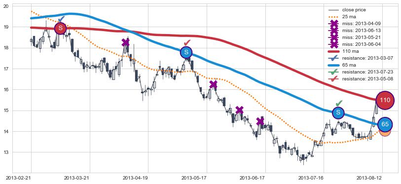 下跌趋势2013-02-21-2013-08-12,均线65, 110确认关键阻力3处