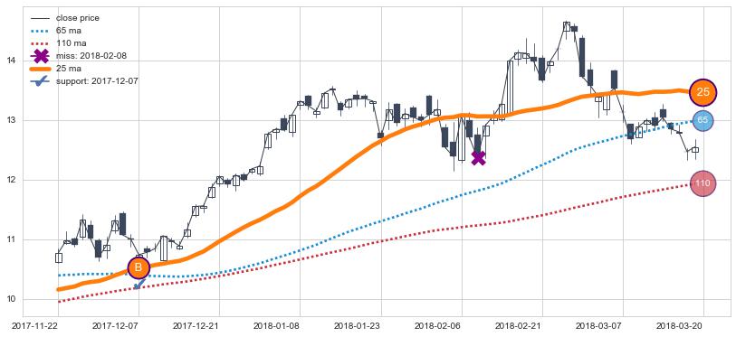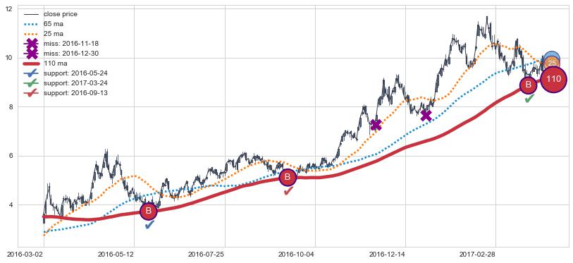 上涨趋势2016-03-02-2017-04-05,均线110确认关键支撑3处