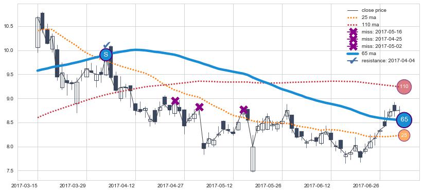 下跌趋势2017-03-15-2017-06-30,均线65确认关键阻力1处