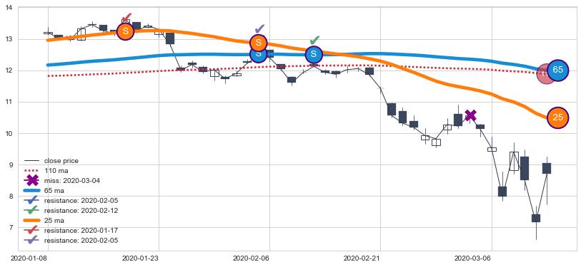 下跌趋势2020-01-08-2020-03-13,均线65, 25确认关键阻力3处