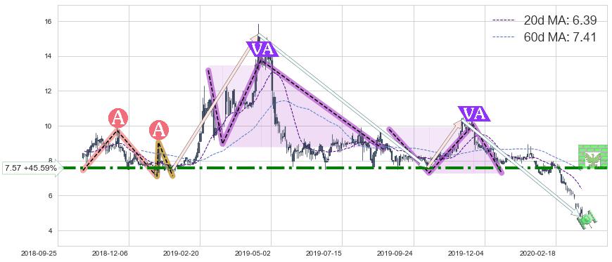 ♘ 阻力价格位7.57,可信任强度84.48%,距离最后交易2020-03-13形成的收盘价格5.20相差 +45.59%