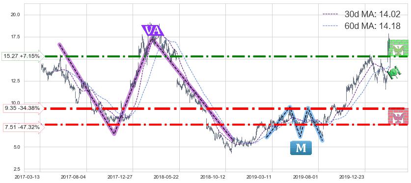 ♘ 阻力价格位15.27,可信任强度72.11%,距离最后交易2020-03-13形成的收盘价格14.25相差 +7.15%