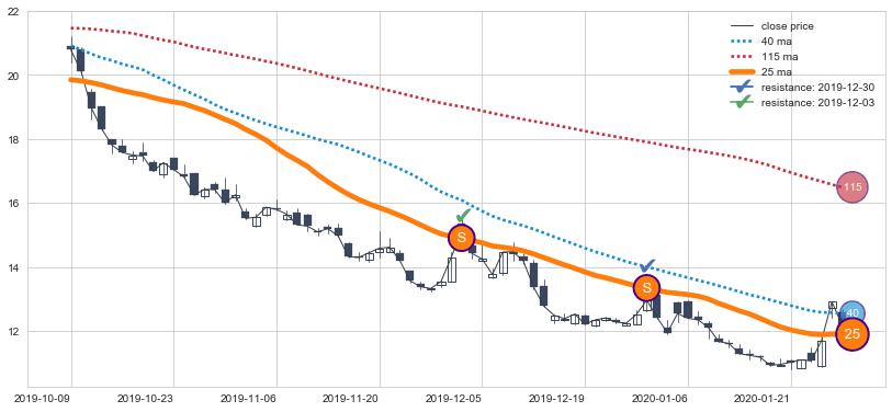 下跌趋势2019-01-09-2019-05-06,均线40, 25, 115确认关键阻力4处