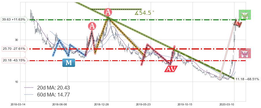♘ 支撑价格位20.18,可信任强度64.41%,距离最后交易2020-03-13形成的收盘价格35.50相差 -43.15%