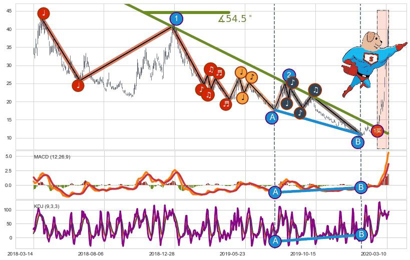 从2018-04-02至2020-01-30,共包含462个交易日,阶段股价下跌-94.58%,阶段股价变动位移路程比: 1 : 13,下跌趋势角度: 54.5