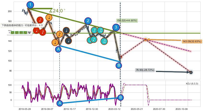 ♘ 在最后的下跌阶段2019-05-16至2020-03-13,存在 持续未破位的阻力位 ,阻力价格156.32,可信任强度84.79%,其距离最后价格107.88相差 +44.90%