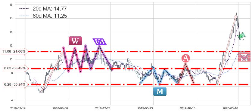♘ 支撑价格位11.08,可信任强度78.46%,距离最后交易2020-03-13形成的收盘价格14.03相差 -21.00%