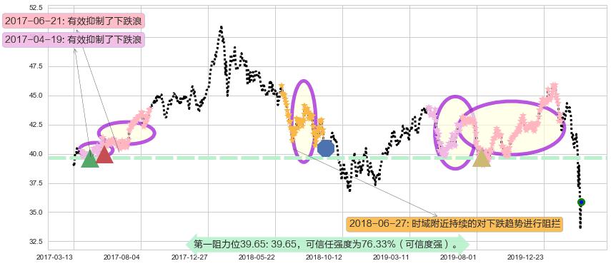 ♞ 第一阻力位39.65价格为39.65,其通过量化计算出的可信任强度为76.33%(可信度强)。