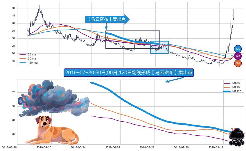 ⚀ 2019-05-30日-2019-09-26日显现 60日-90日-120日均线 【乌云密布】卖出点 看空信号,后市看跌,卖出