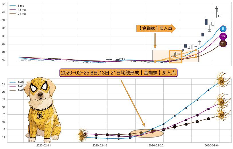 ⚀ 2020-02-25日显现 8日-13日-21日均线 【金蜘蛛】买入点 看多信号,后市看涨,买入