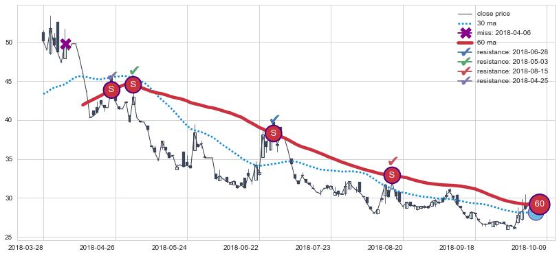 ⚄ 短期均线MA30上穿中期均线MA60形成的交叉是标准 黄金交叉