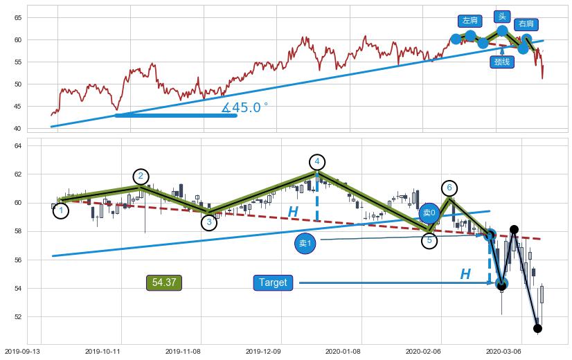 ➢ 高点影线(2020-03-13: 54.37 )→回踩→第一根k线低点(2020-03-11: 54.19 )