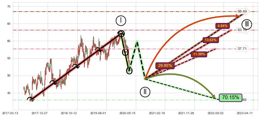 ➣ 高概率大级别循环上涨浪被破坏,反转向下(突破5浪起点)概率70.15%