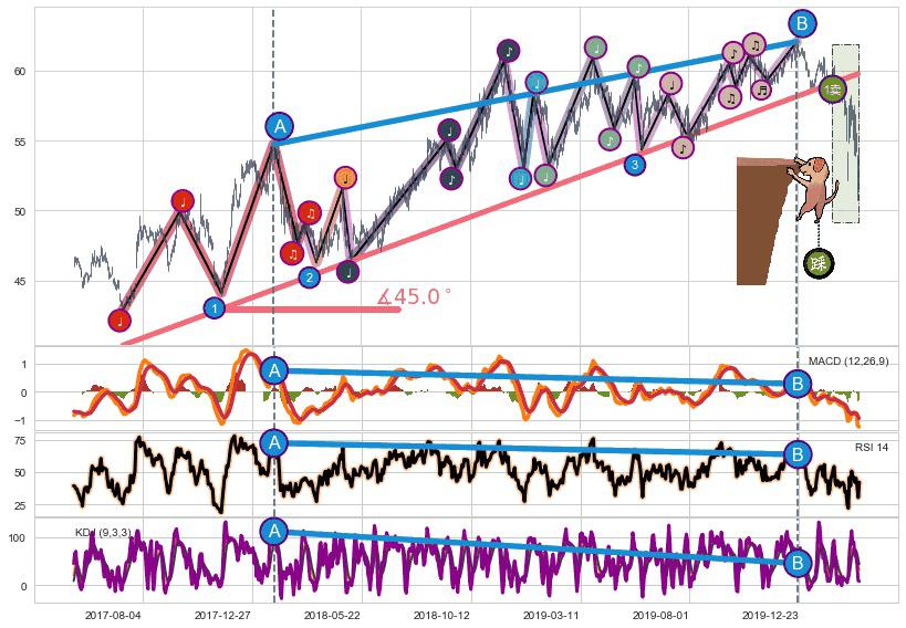 ✂️ 2017-07-11-2020-01-08上升趋势存在反转[风险],其原上升趋势的支撑位(59.77)已破位[强阻力信号],原上升趋势角度: 45.0˚
