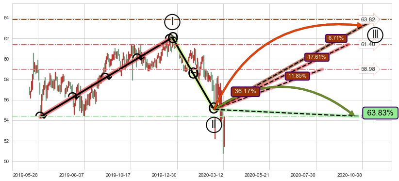 ➢ 循环浪继续向上【最高】位置(2020-10-27, 63.82),匹配聚类样本比例18.56%, 可能性概率6.71%