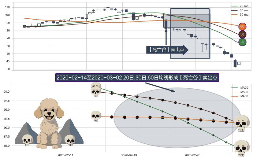 ⚂ 【死亡谷】卖出点 由MA20均线下穿MA30均线和MA60均线,MA30均线下穿MA60均线形成