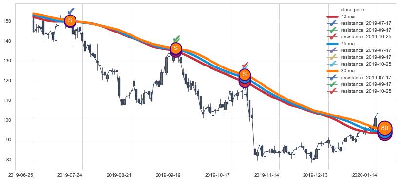 下跌趋势2019-06-25-2020-01-14,均线80, 75, 70确认关键阻力3处