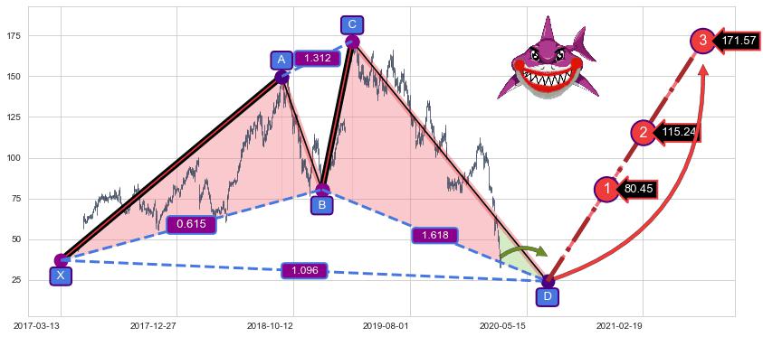 ➣ 未完成【鲨鱼】形态起点X: 2017-03-14, 已到达C点: 2019-03-12, 预测最终D点: 2020-07-06, 共835交易日